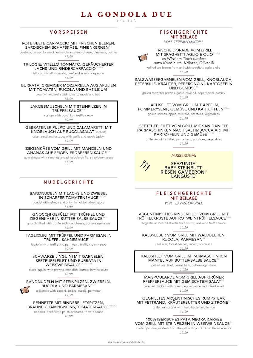 Located in the historic Beerenstraße 57, Berlin, La Gondola Due offers an unforgettable dining experience. Renowned for its impeccable Italian cuisine, the restaurant boasts a menu that delights the senses. Guests rave about the chanterelle appetizer and the exquisite truffle-encrusted sea brim. Each dish is crafted with precision by a talented chef who understands the art of flavor.
